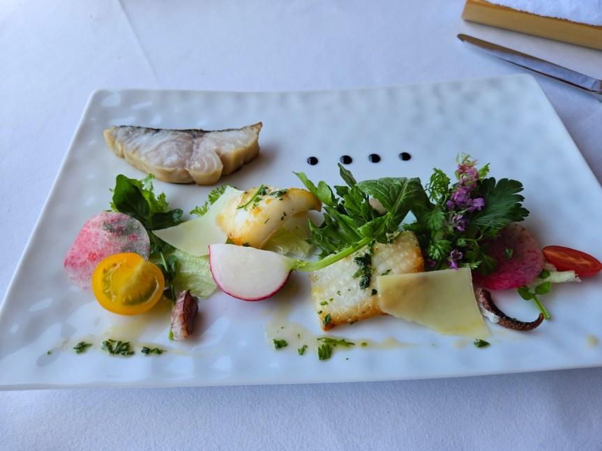 Salad of pan-fried squid and lightly smoked sawa mackerel with balsamic essence with herb vinaigrette.