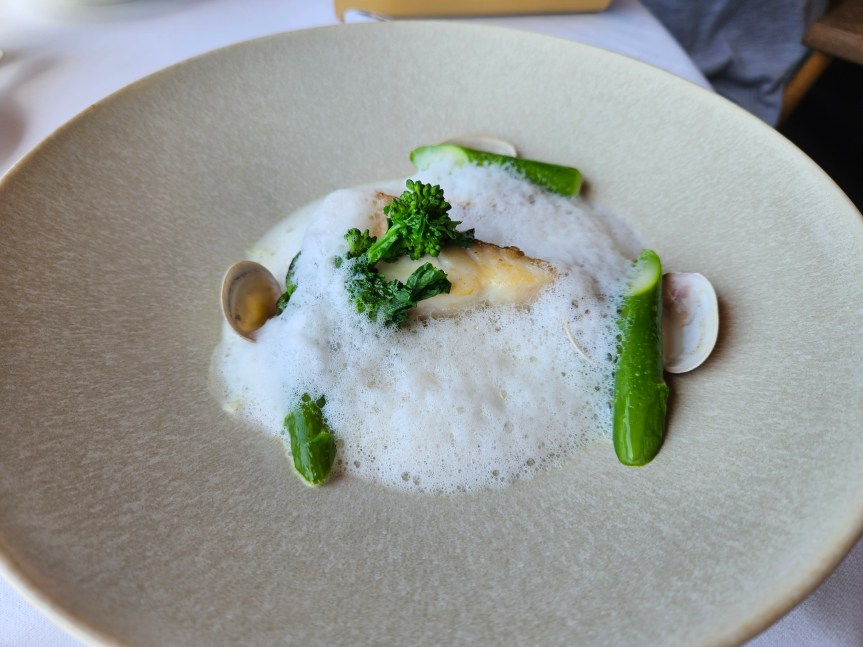 Pan-fried fillet of Sakuradai bream with braised spring cabbage and asari clams with vermouth sauce