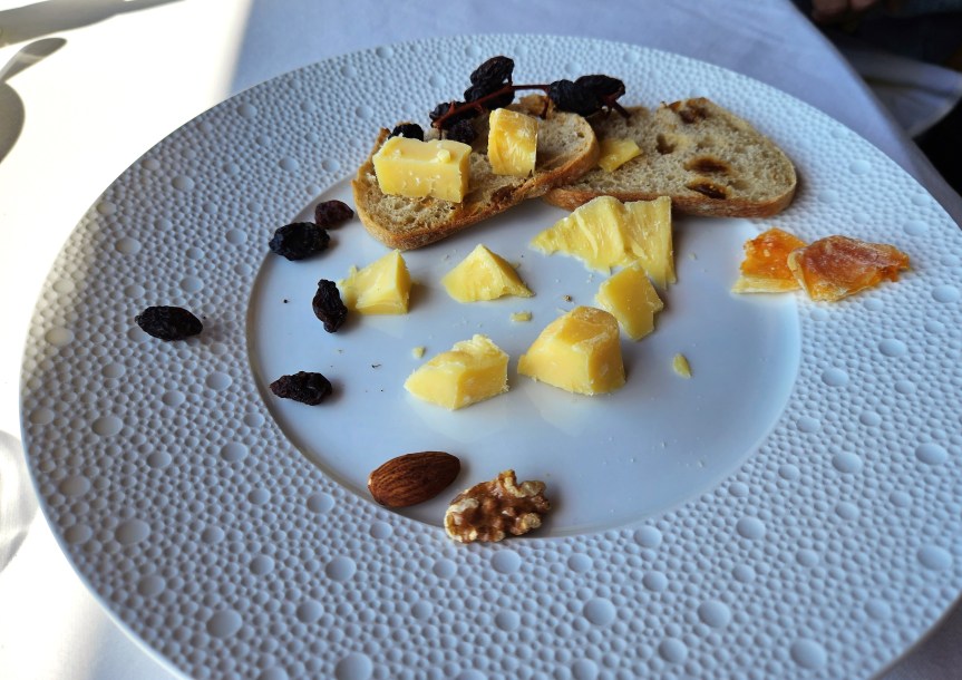 Chariot de fromages with a selection of fine French cheeses such as Blue Cheese, Brie, and Comte.