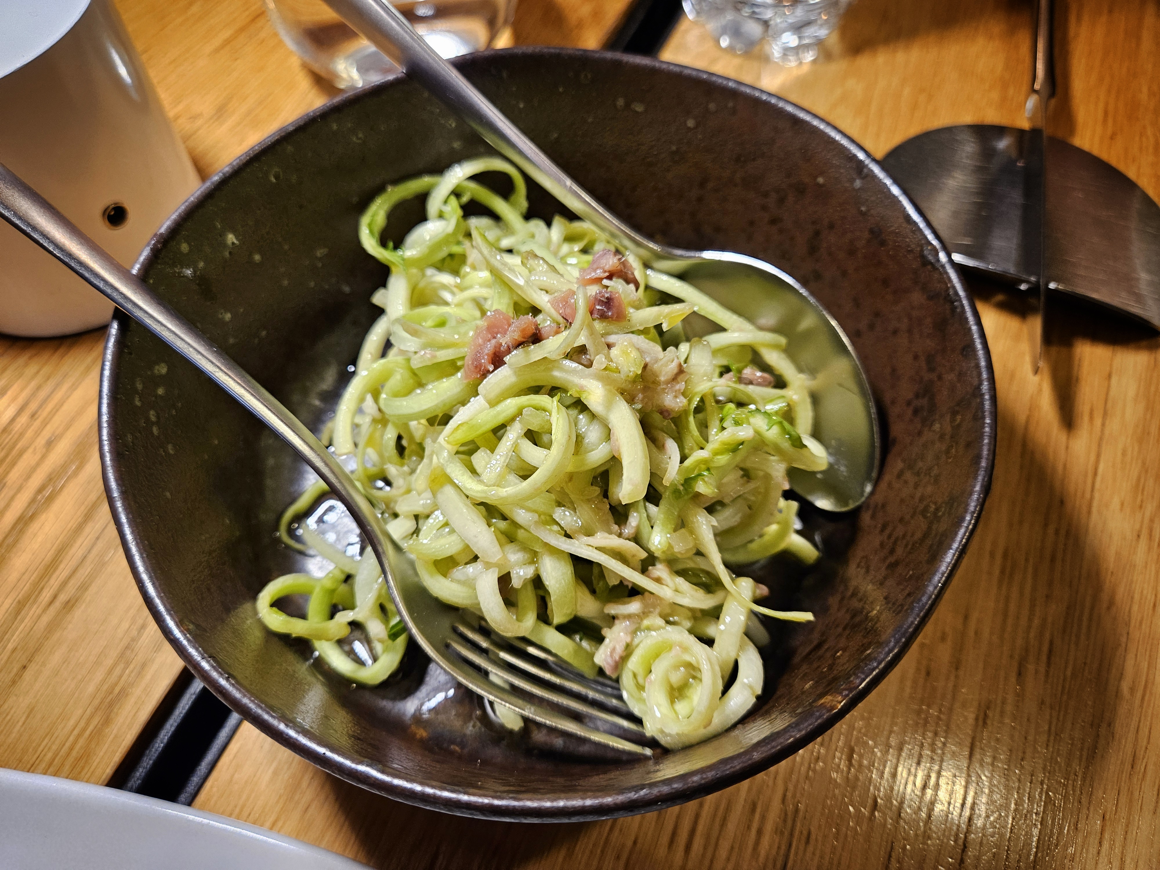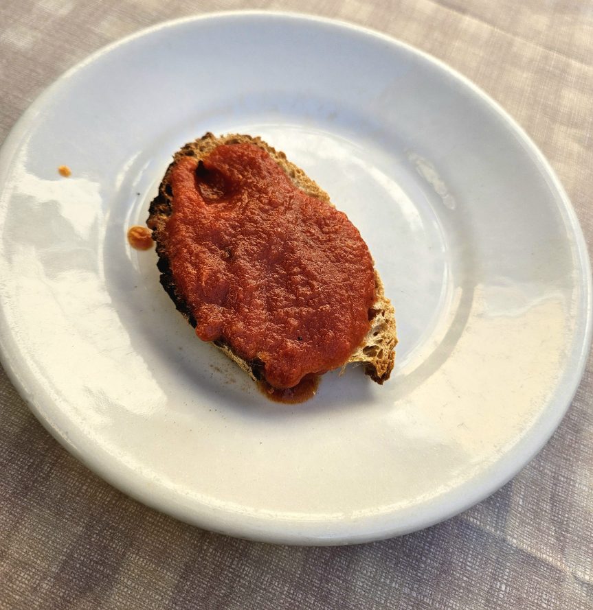 Puntarella is a type of chicory with a mild bitterness, resembling the texture of celery root and a touch of fennel. It’s a popular dish in Rome. The puntarella we ordered was refreshing and crisp, enhanced by the salty umami flavors from the anchovies.