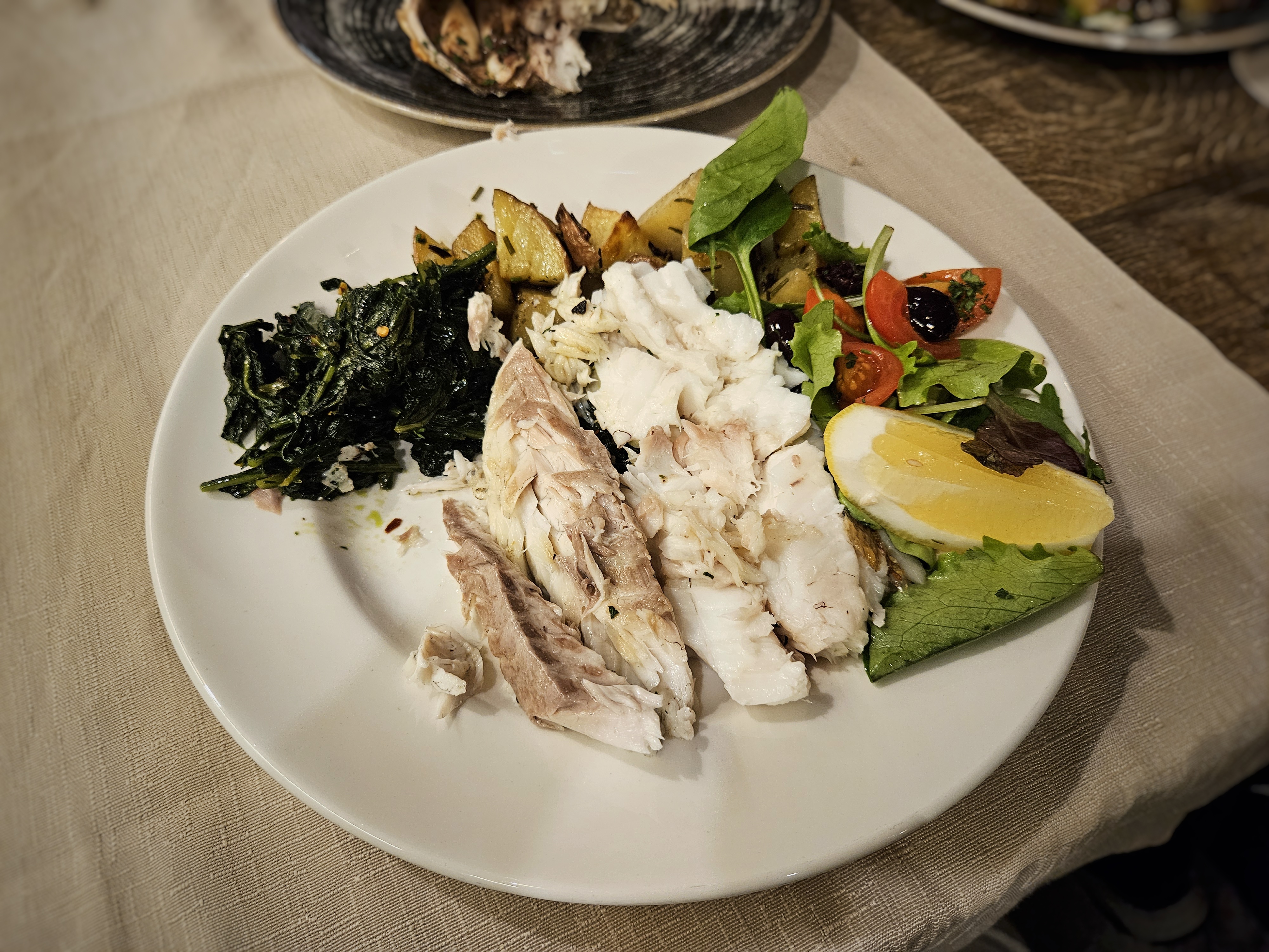 We selected two of the freshest fish from the display case, as not all were fresh. Once grilled, the server presented them to us before deboning and plating them, ensuring the sides were evenly distributed. The grilled fish came with roasted potatoes, mixed salad, and sautéed broccoli rabe. The broccoli rabe was overly salty, and while the fish were grilled well, they were somewhat bland.