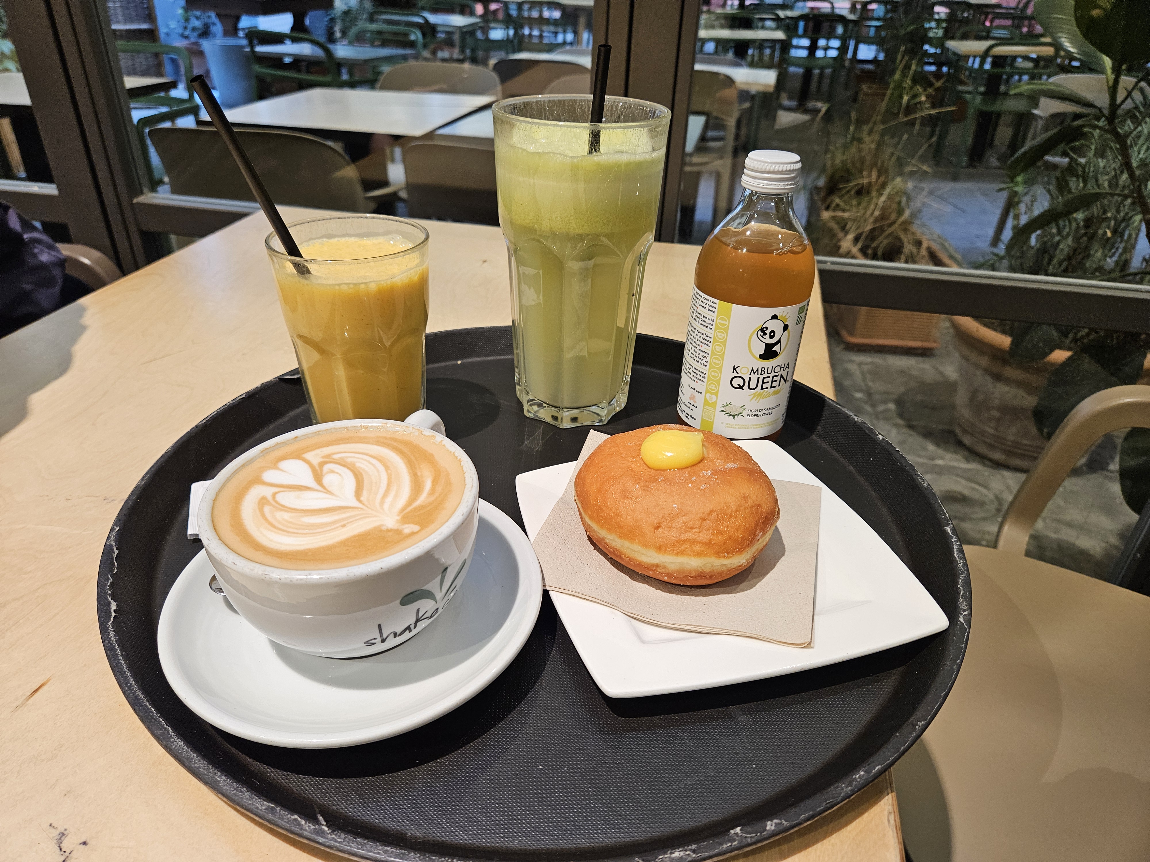 We enjoyed a custard donut, a bottle of kombucha, a cappuccino, and two refreshing juices: I AM STRONG (carrot, orange, lemon, ginger) and DETOX (celery, fennel, spinach, kale, parsley, apple, lemon, ginger).