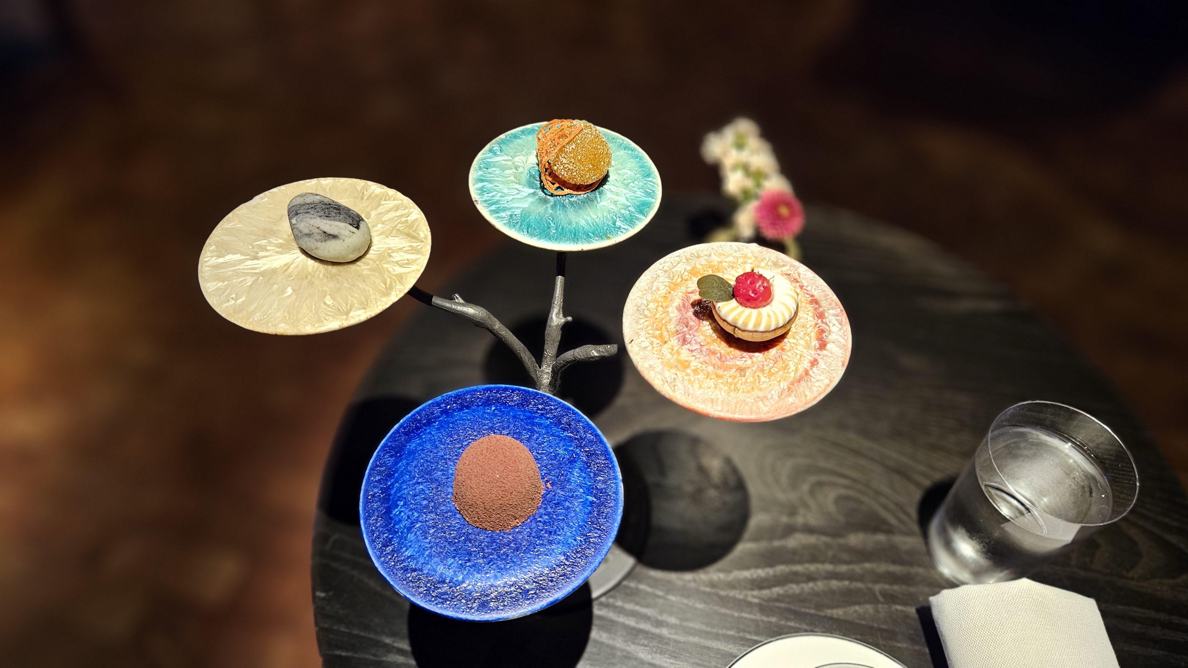 Dessert was a visual and sensory delight. Mignardises were served on a striking tree-like serving plate, adding an artistic and natural touch to the presentation. These small, bite-sized treats included a variety of textures and flavors—sweet, tangy, and nutty—that offered a perfect conclusion to the meal. Each piece was meticulously crafted, showcasing the restaurant’s attention to detail.